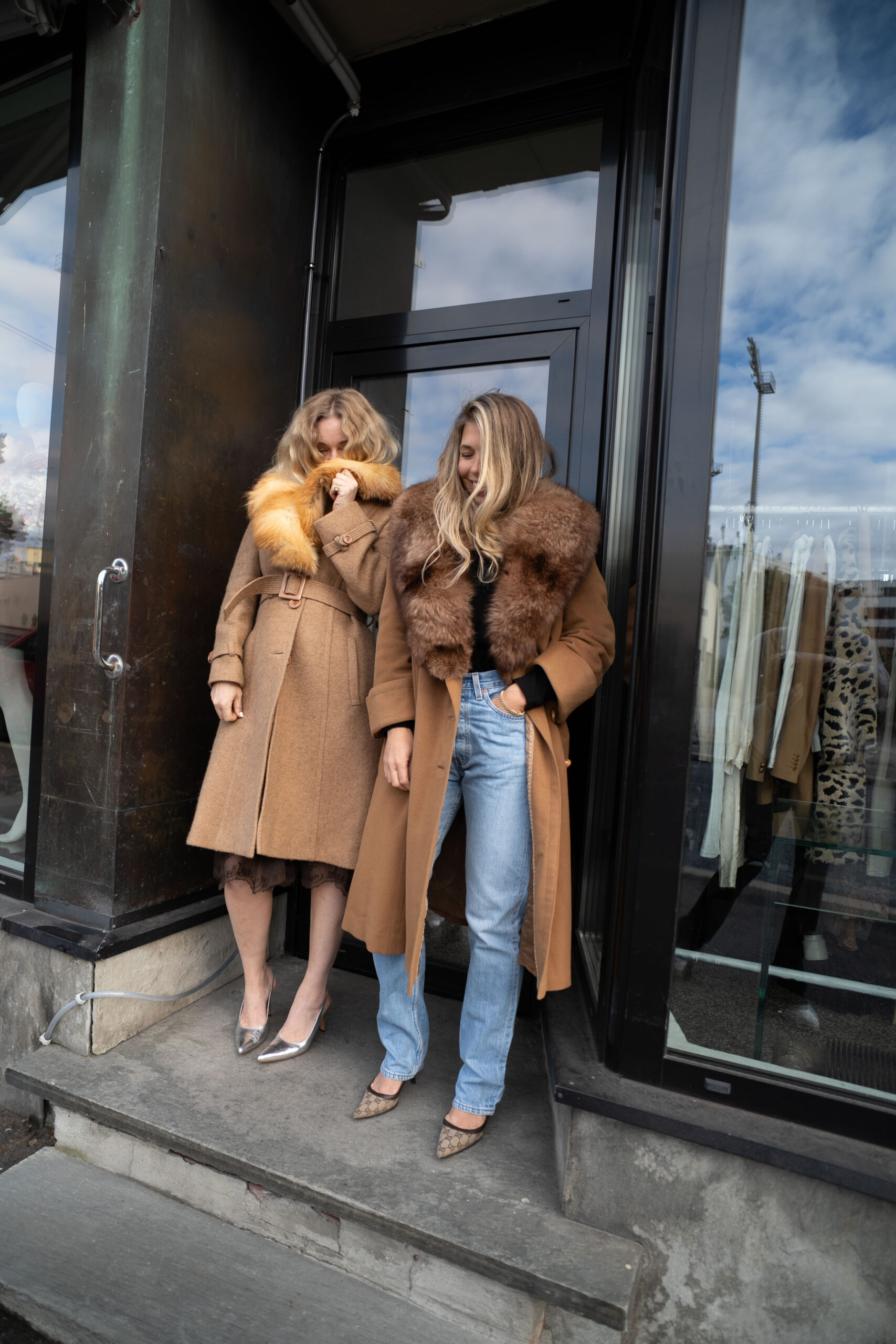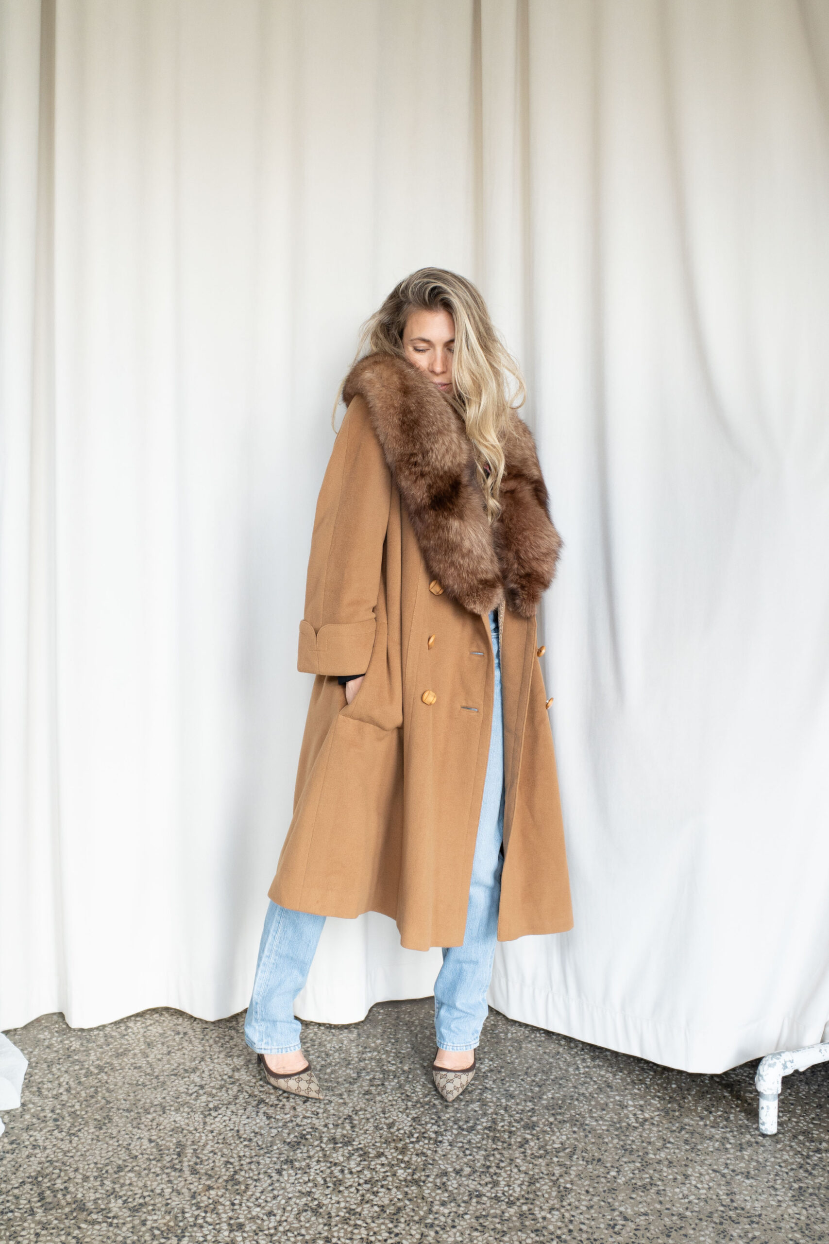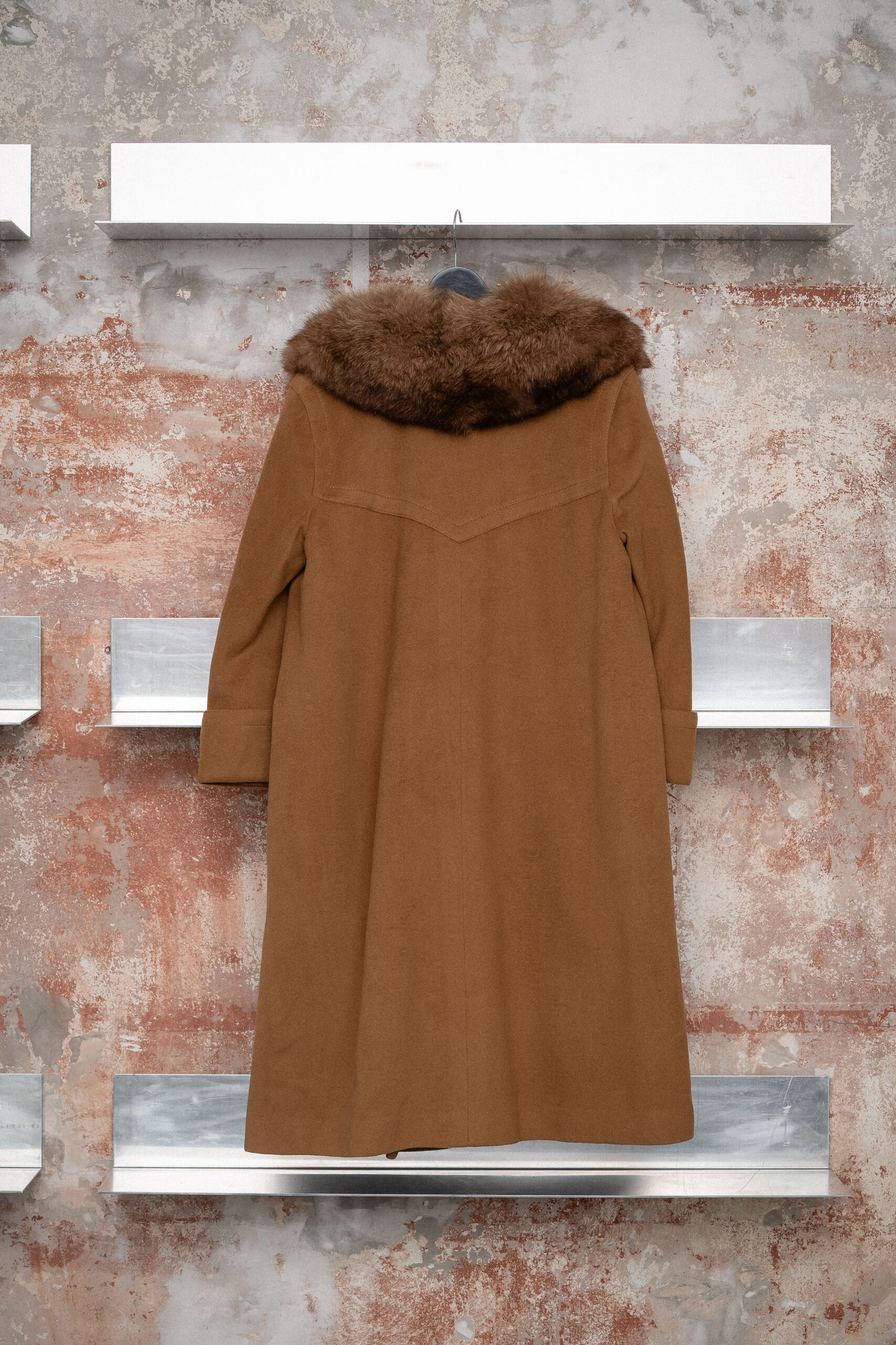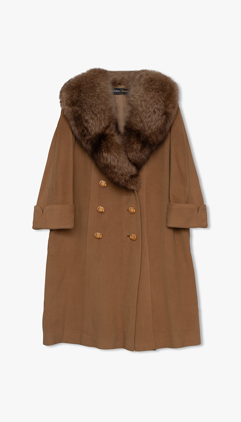 Nydelig beige kåpe, produsert i Paris med stor pelskrage og knapper.