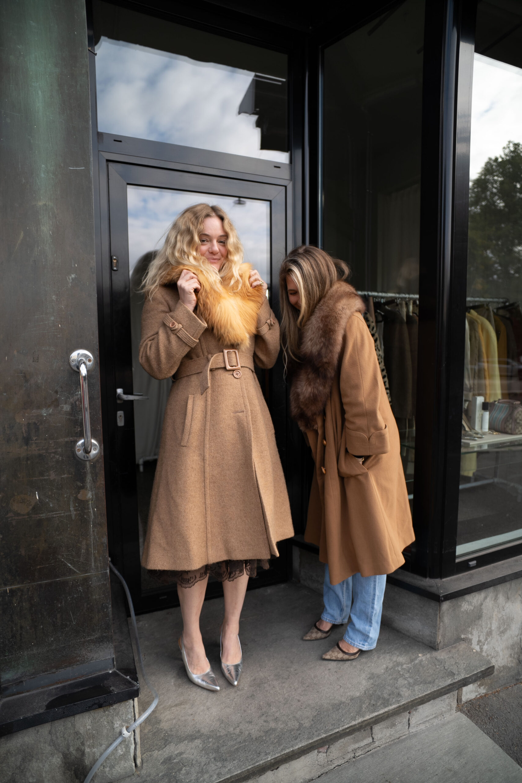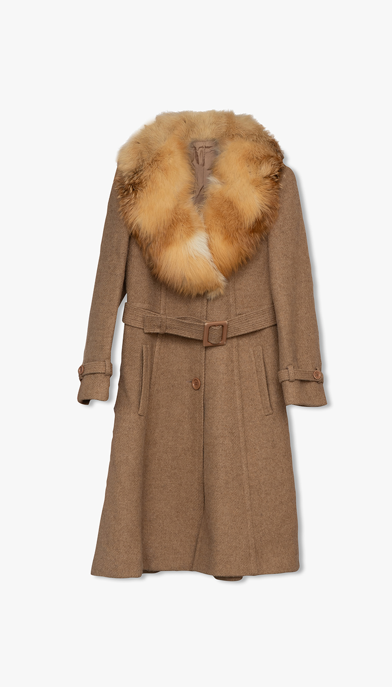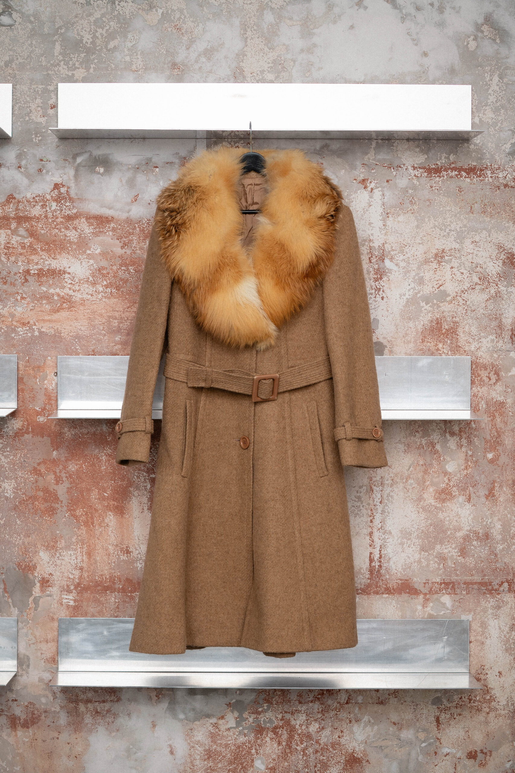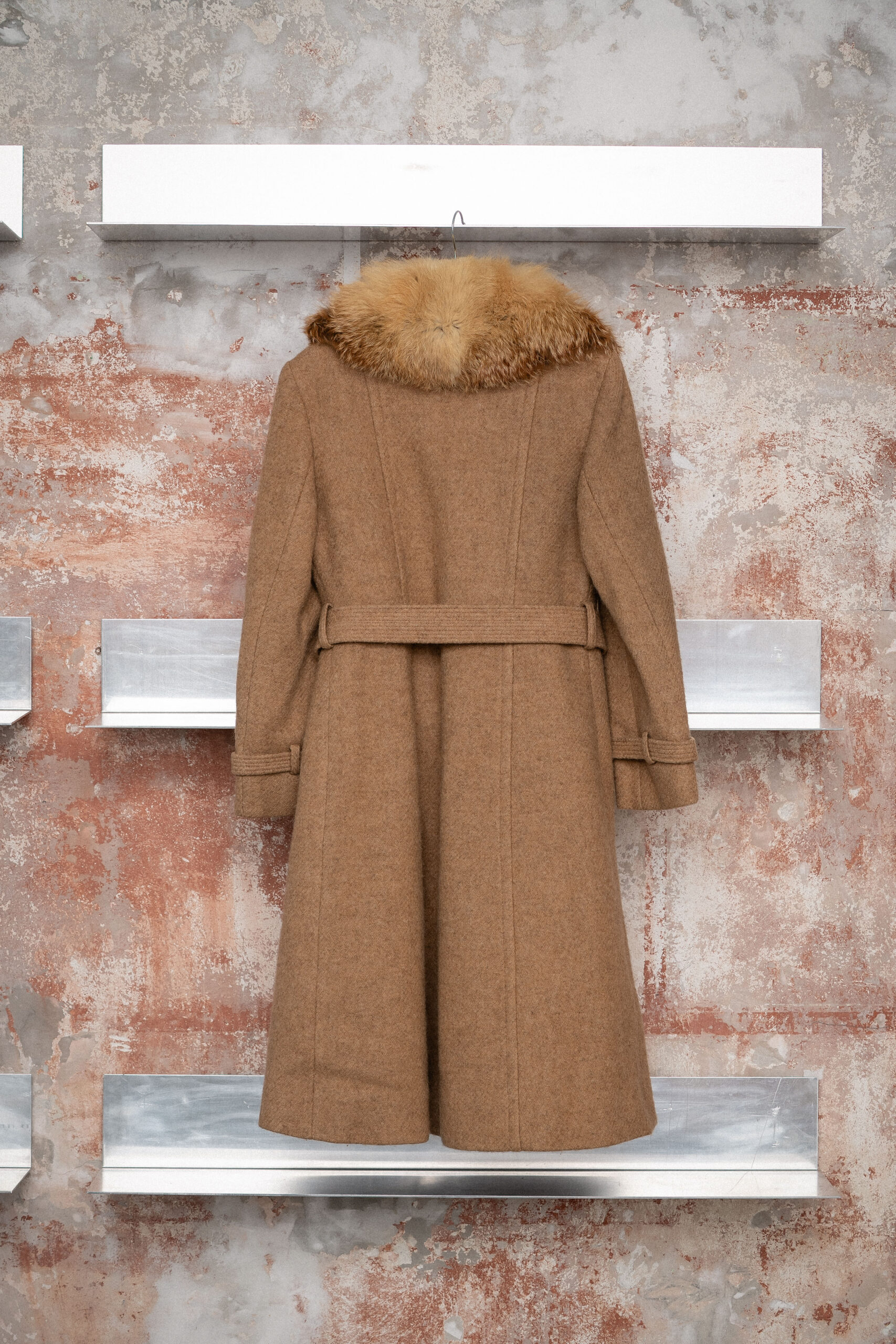 Nydelig beige ullkåpe med belte i midjen og stor revekrage