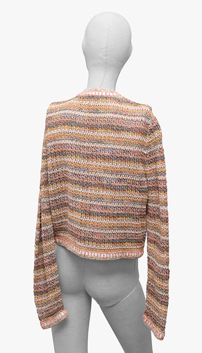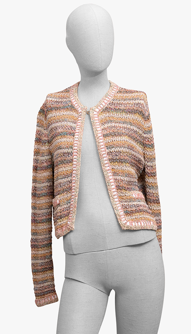 Soft, textural, and unmistakably refined, this CHANEL multicolor knit jacket is a modern take on the house’s iconic cardigan silhouette. Woven in a rich blend of tones—warm neutrals, soft pastels, and subtle metallics—it creates that signature CHANEL depth and dimension.