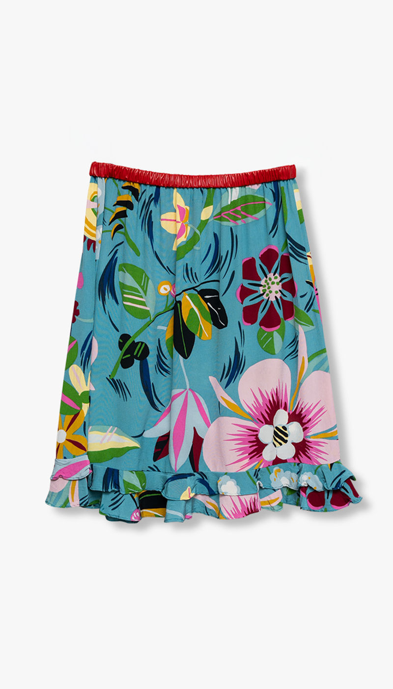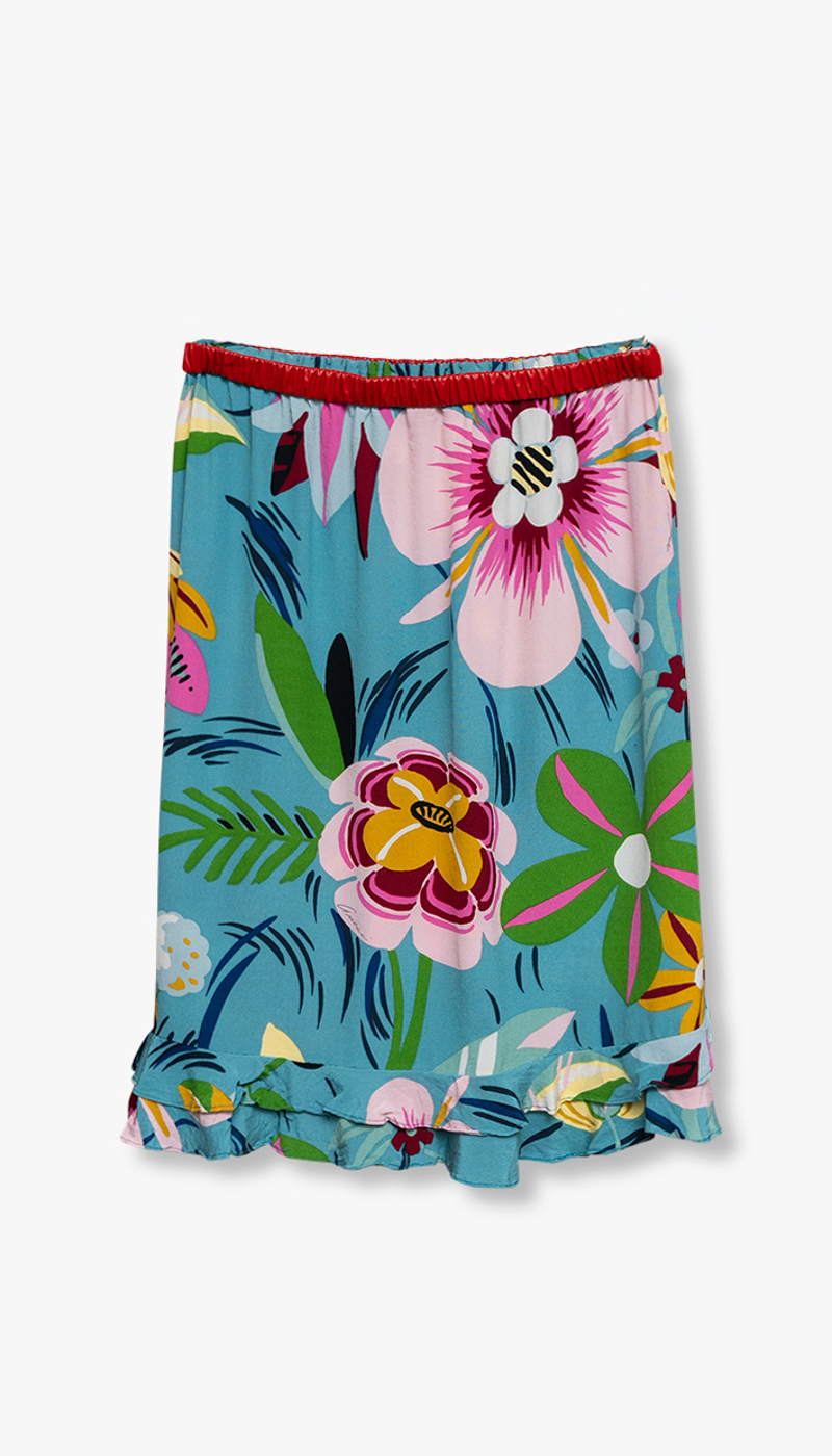 Designet i lett og luksuriøs silk crepe de chine med et eksotisk blomsterprint i sterke, lekne farger. Skjørtet har en elastisk midje med rødt, rynket skinn som gir en uventet edge, balansert med en feminin volangkant nederst.