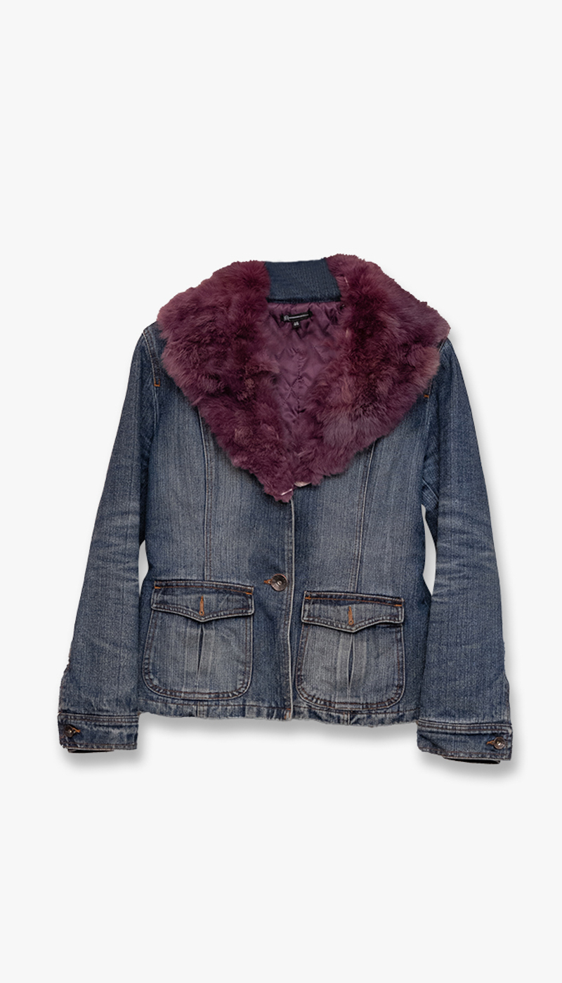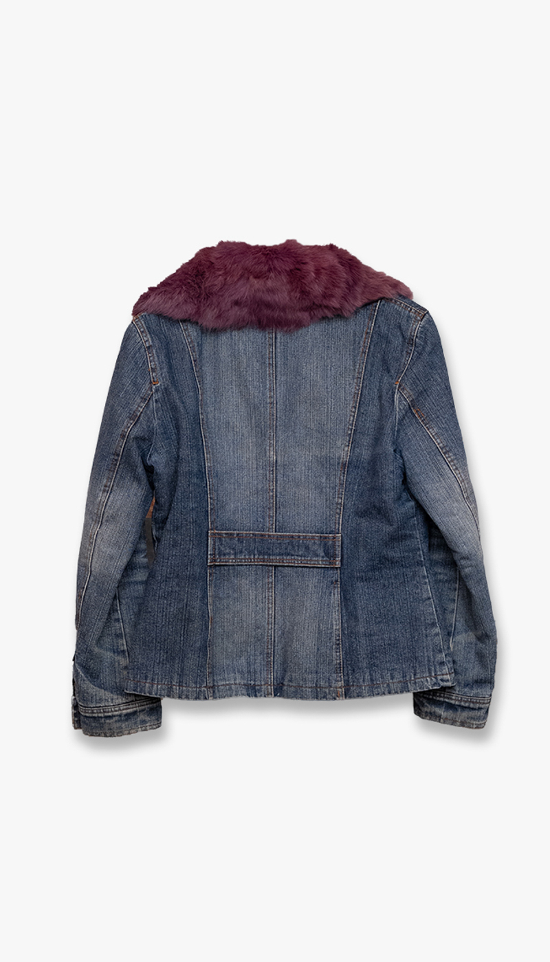 Kort foret jeansjakke med lilla pelskrage