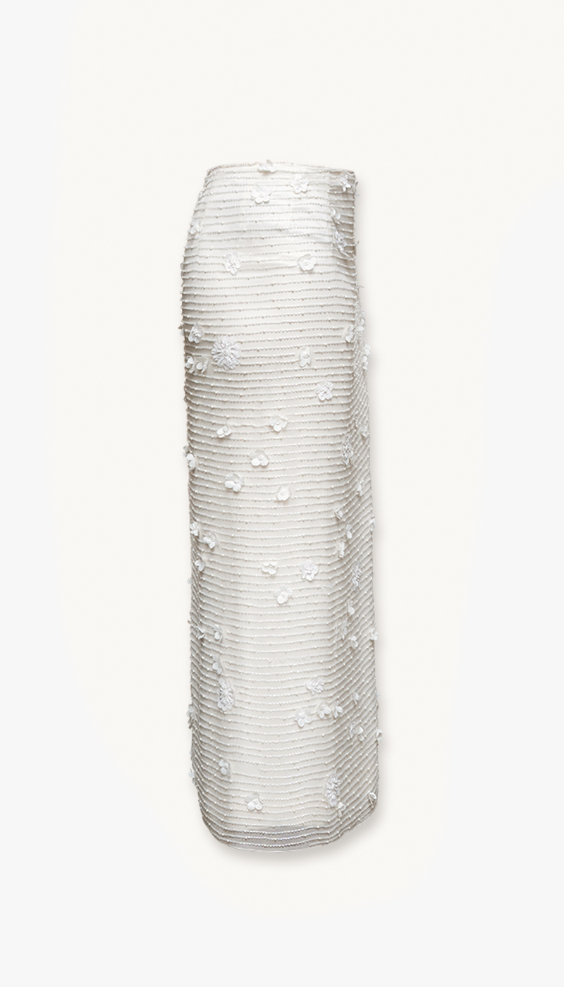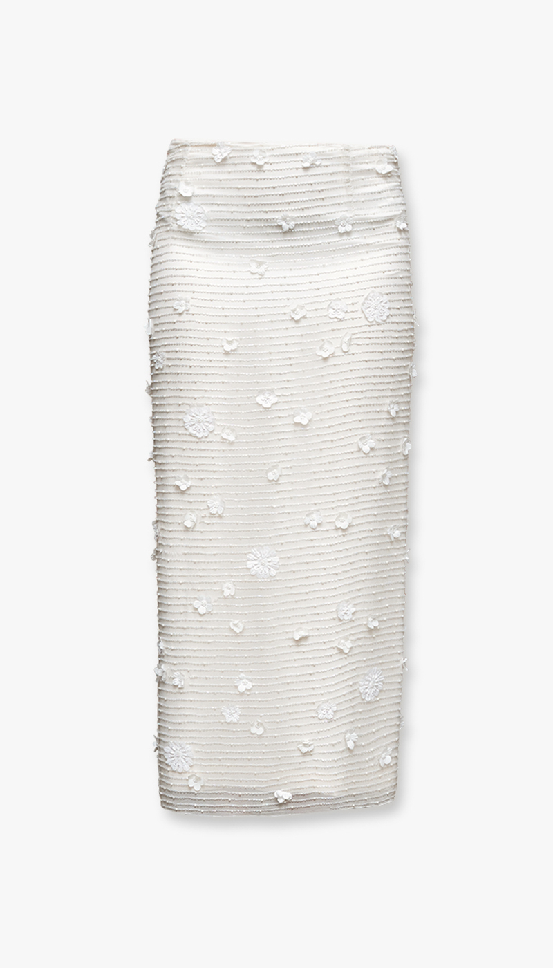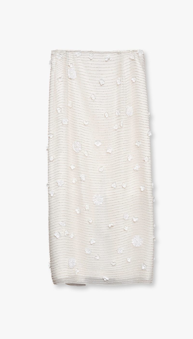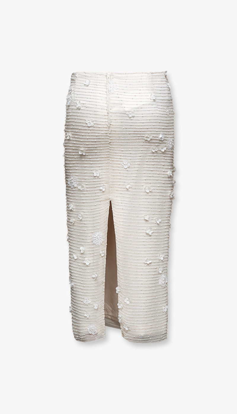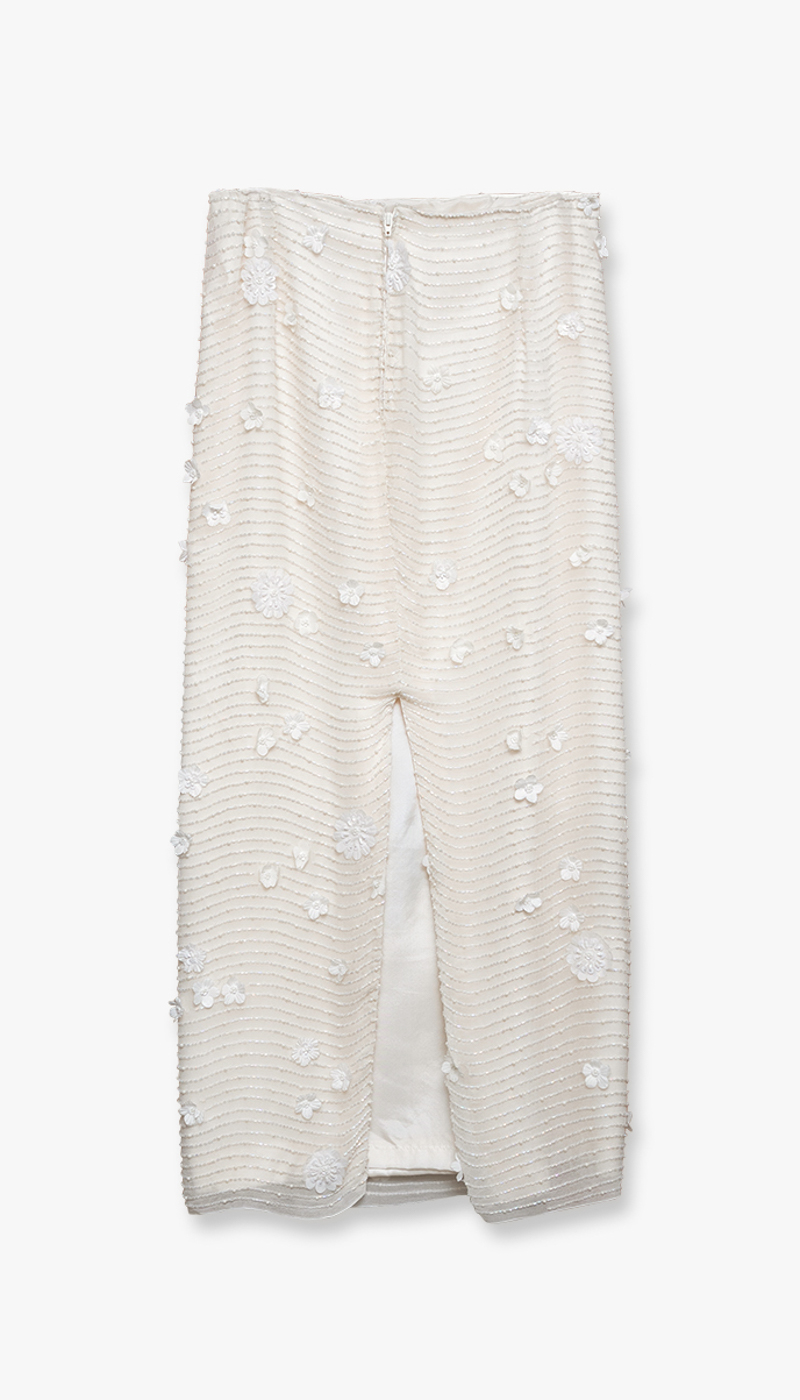 Dette lange skjørtet er et elegant statement-plagg som kombinerer romantiske detaljer med et moderne uttrykk. De delikate blomsterapplikasjonene gir skjørtet en tredimensjonal effekt som skaper liv og bevegelse, mens de fine perledetaljene tilfører et subtilt hint av luksus. Sammen gir disse elementene et sofistikert og gjennomført design som skiller seg ut.