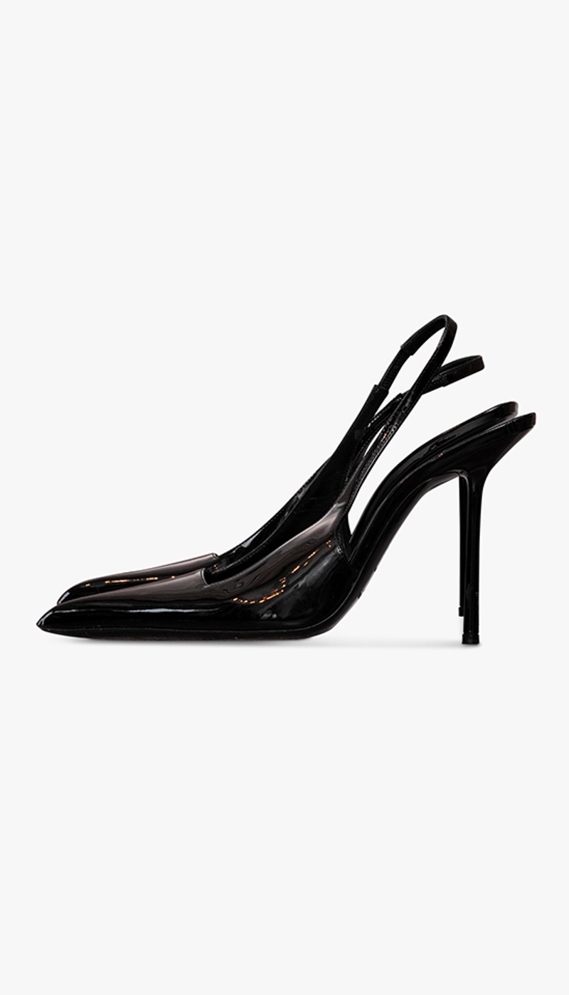 Sharp, minimal, and undeniably timeless, these Saint Laurent black slingback pumps embody effortless Parisian elegance. Crafted in glossy patent leather, they feature a sleek pointed toe and a clean, sculpted silhouette that elongates the leg with precision.