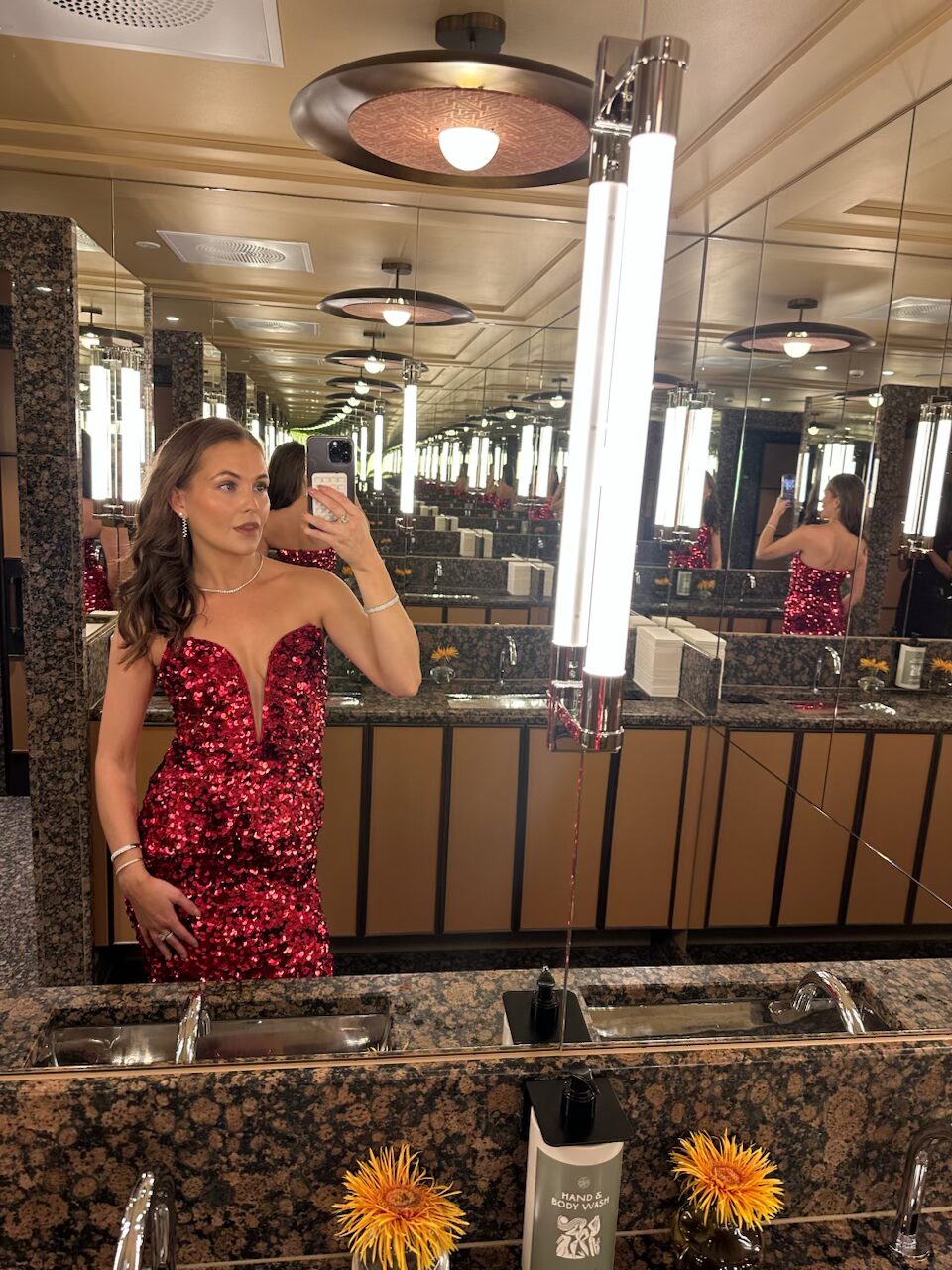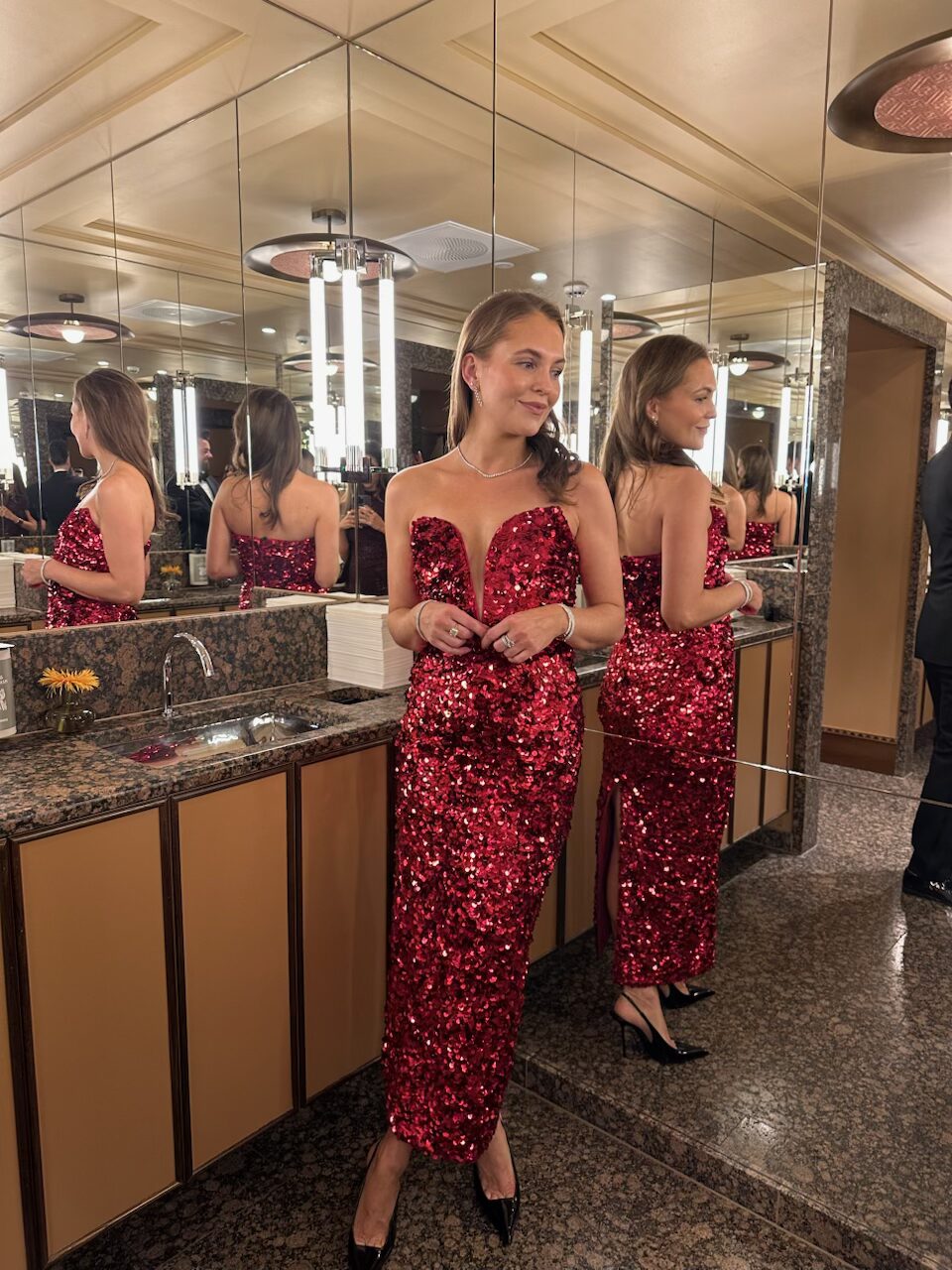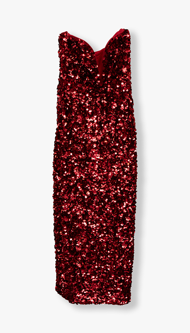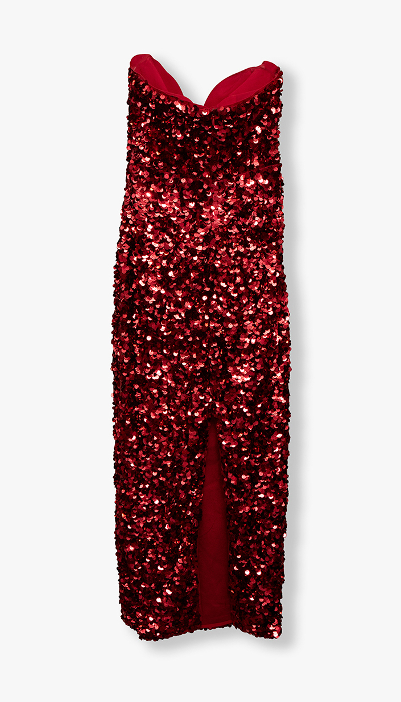 A red sequin dress from Self-Portrait, a mix of high-impact glamour with a clean, controlled silhouette. The all-over red sequins bring the drama, but the structured strapless bodice and straight column cut keep it polished and wearable.