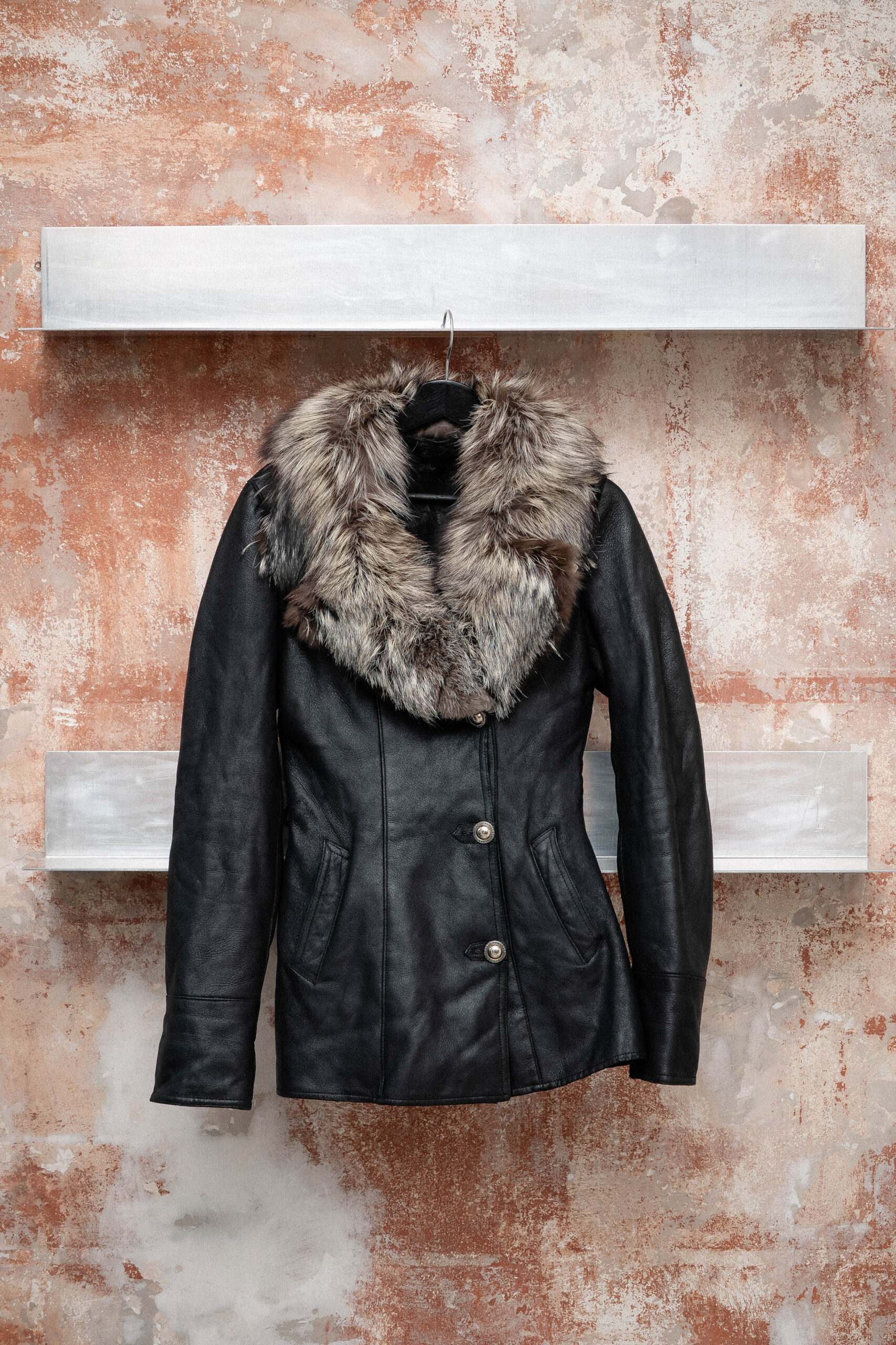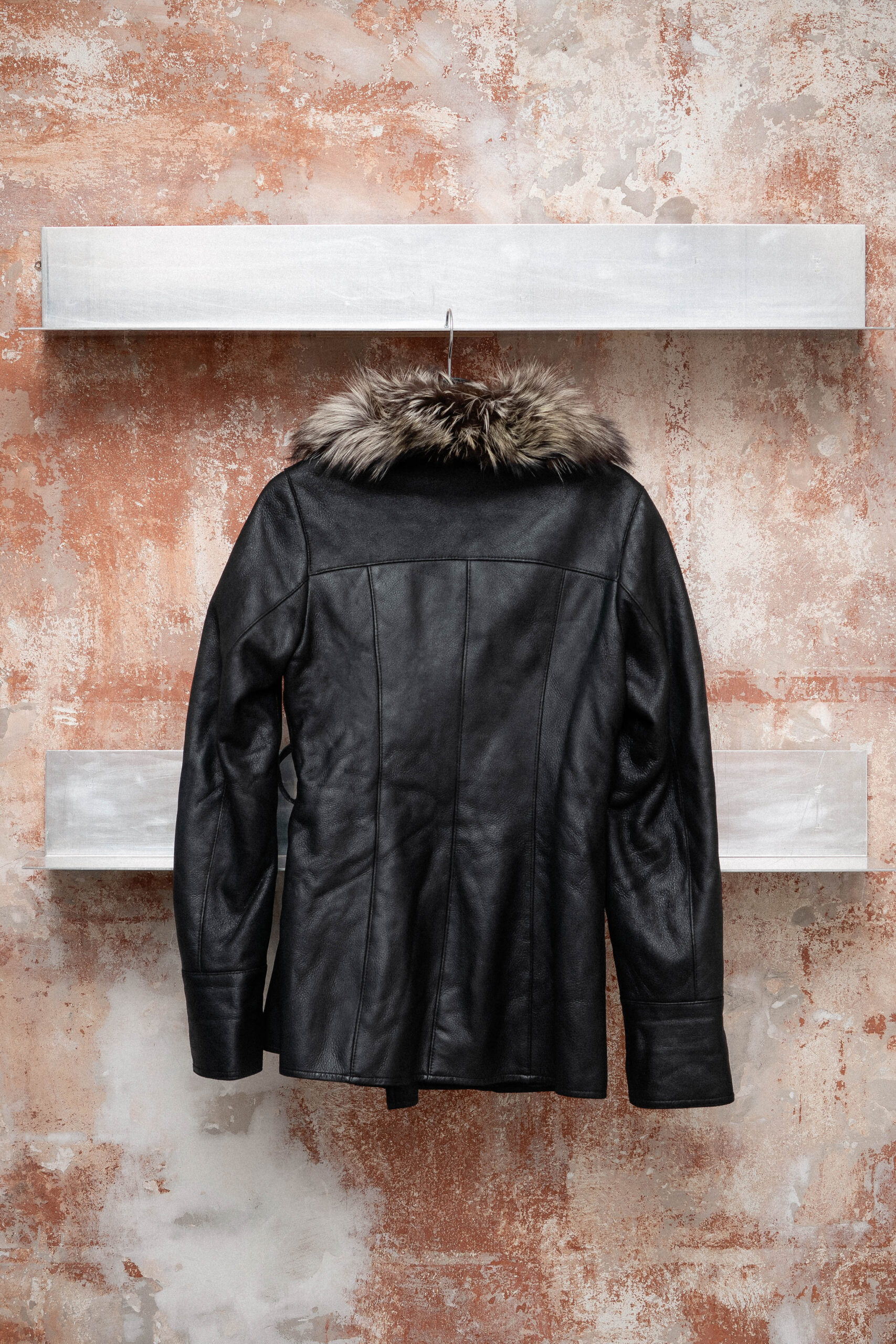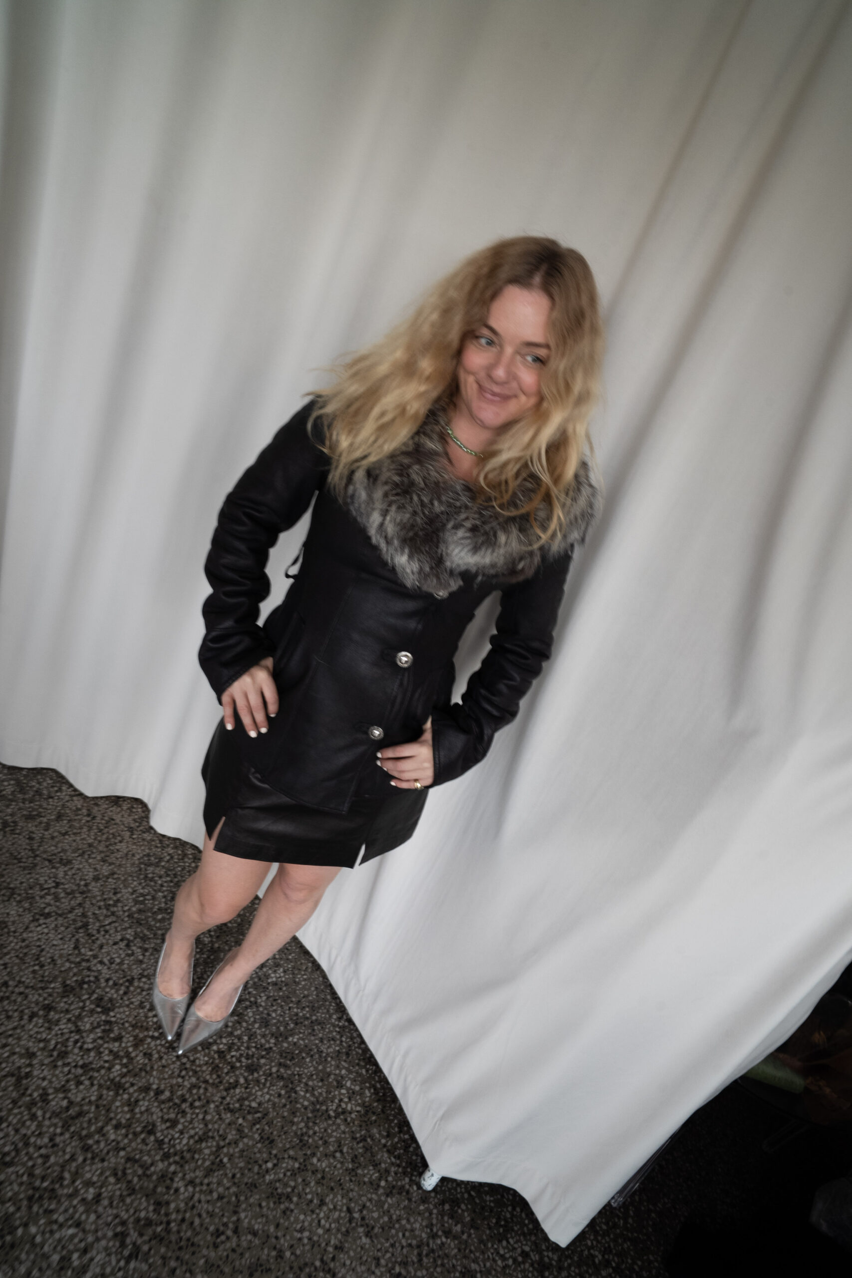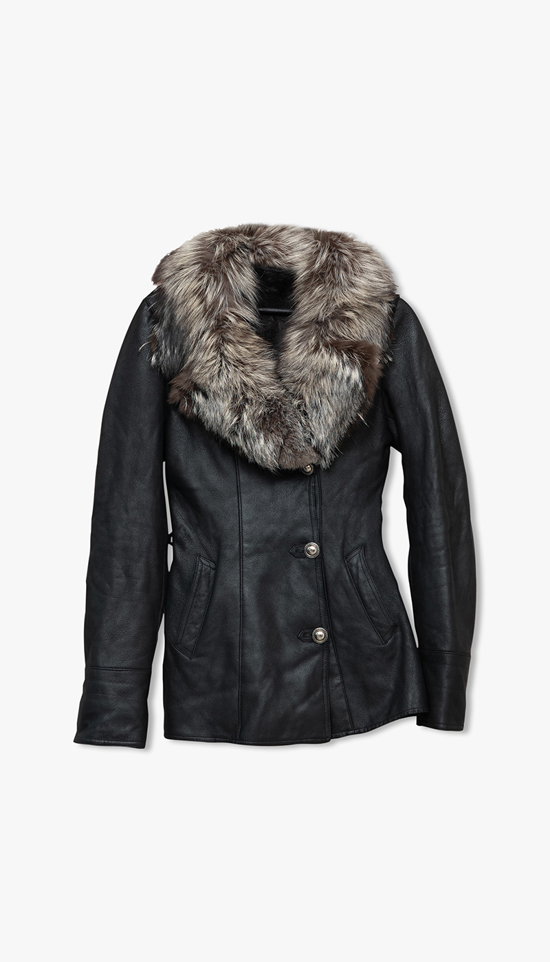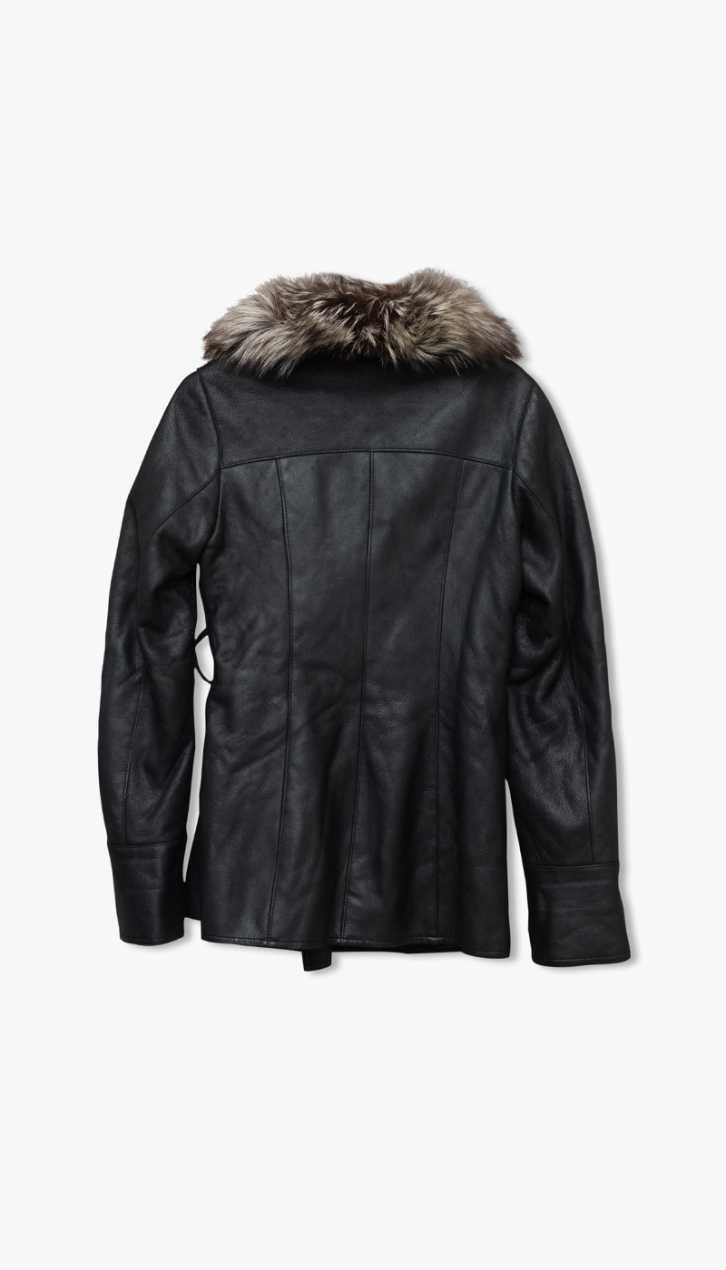Svart skinnjakke med grå pels på kragen