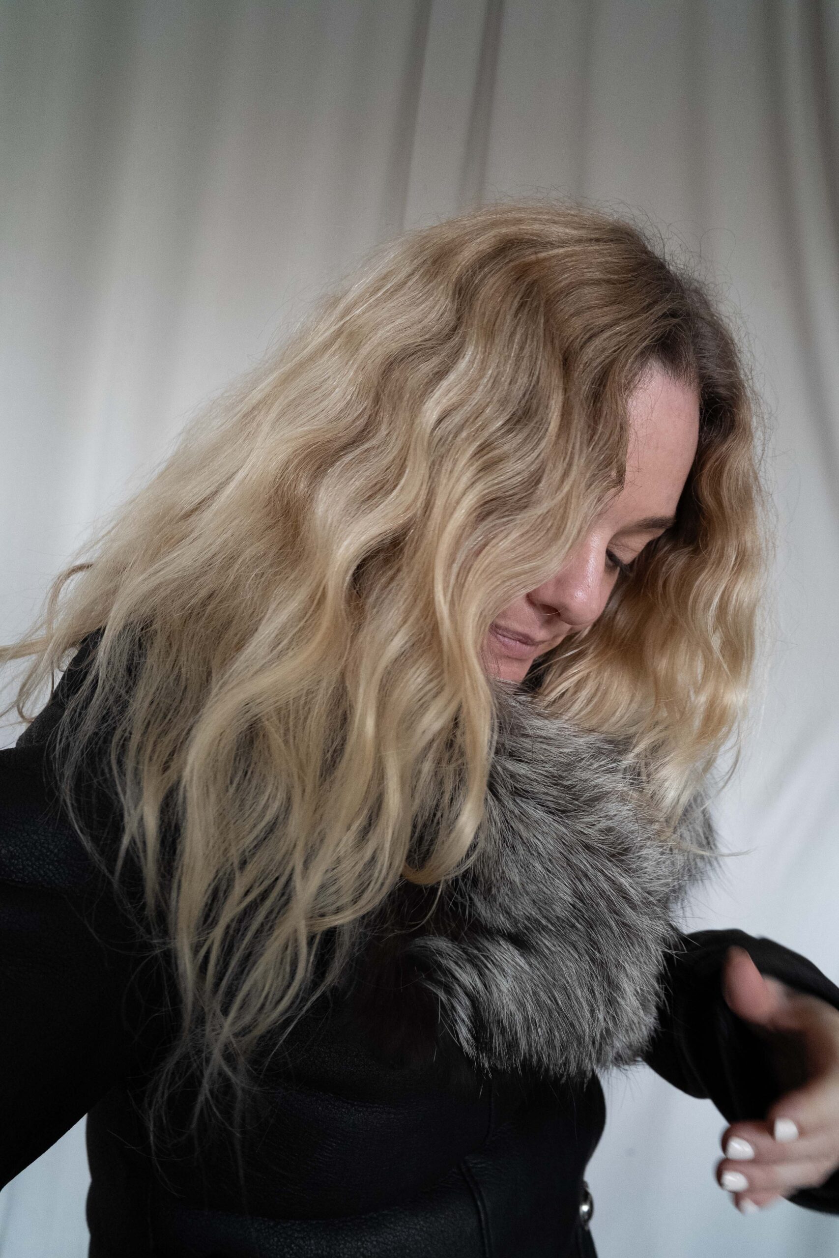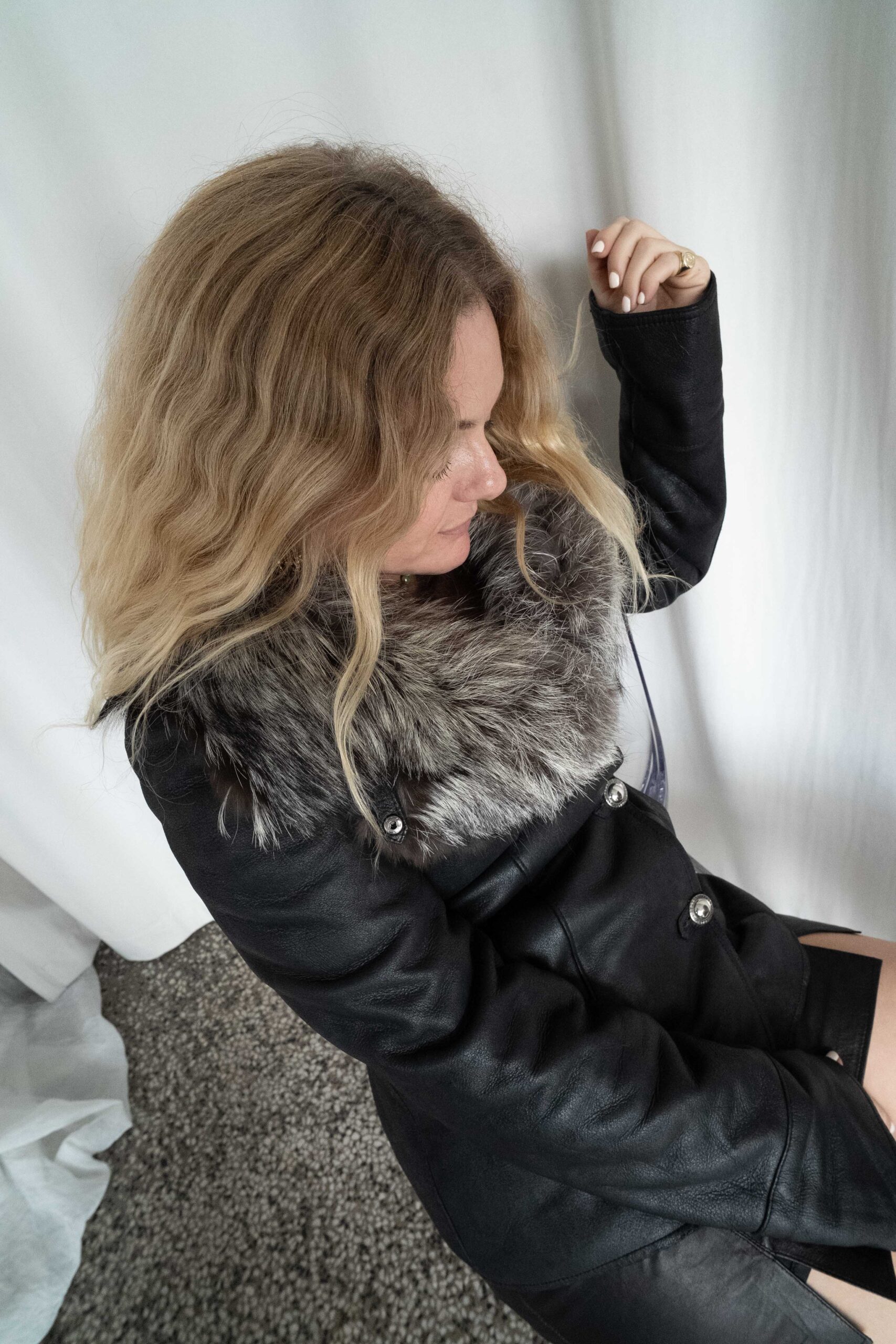 Svart skinnjakke med grå pels