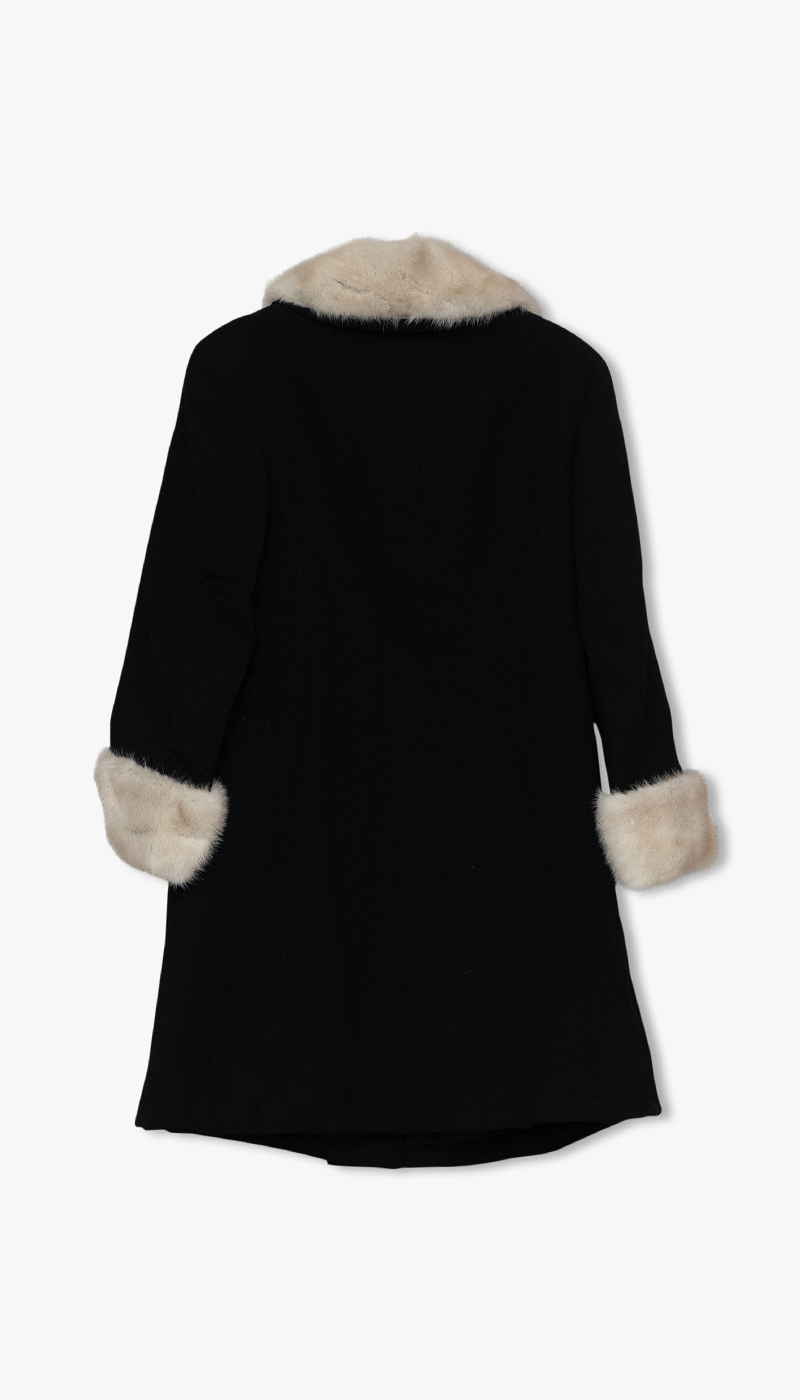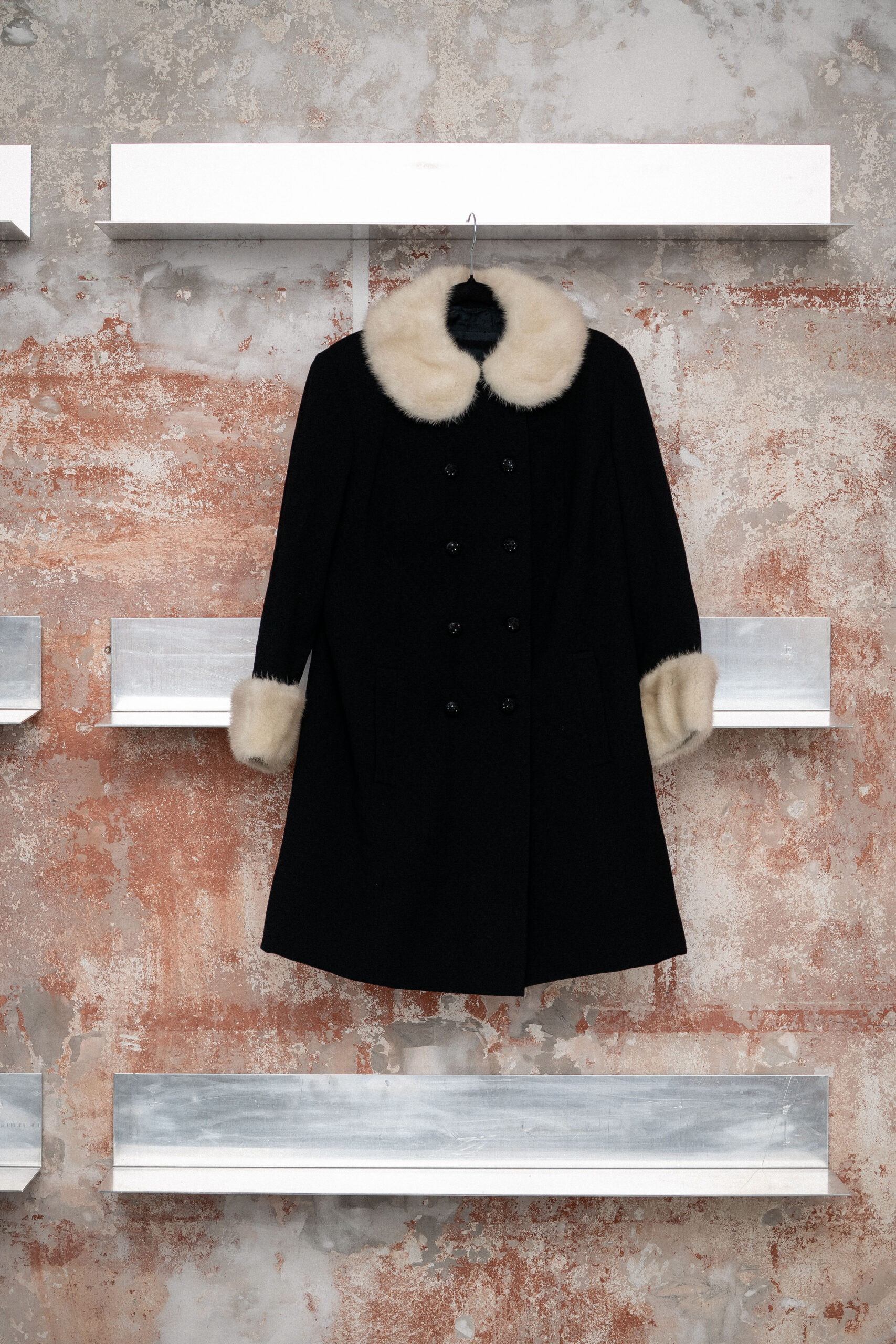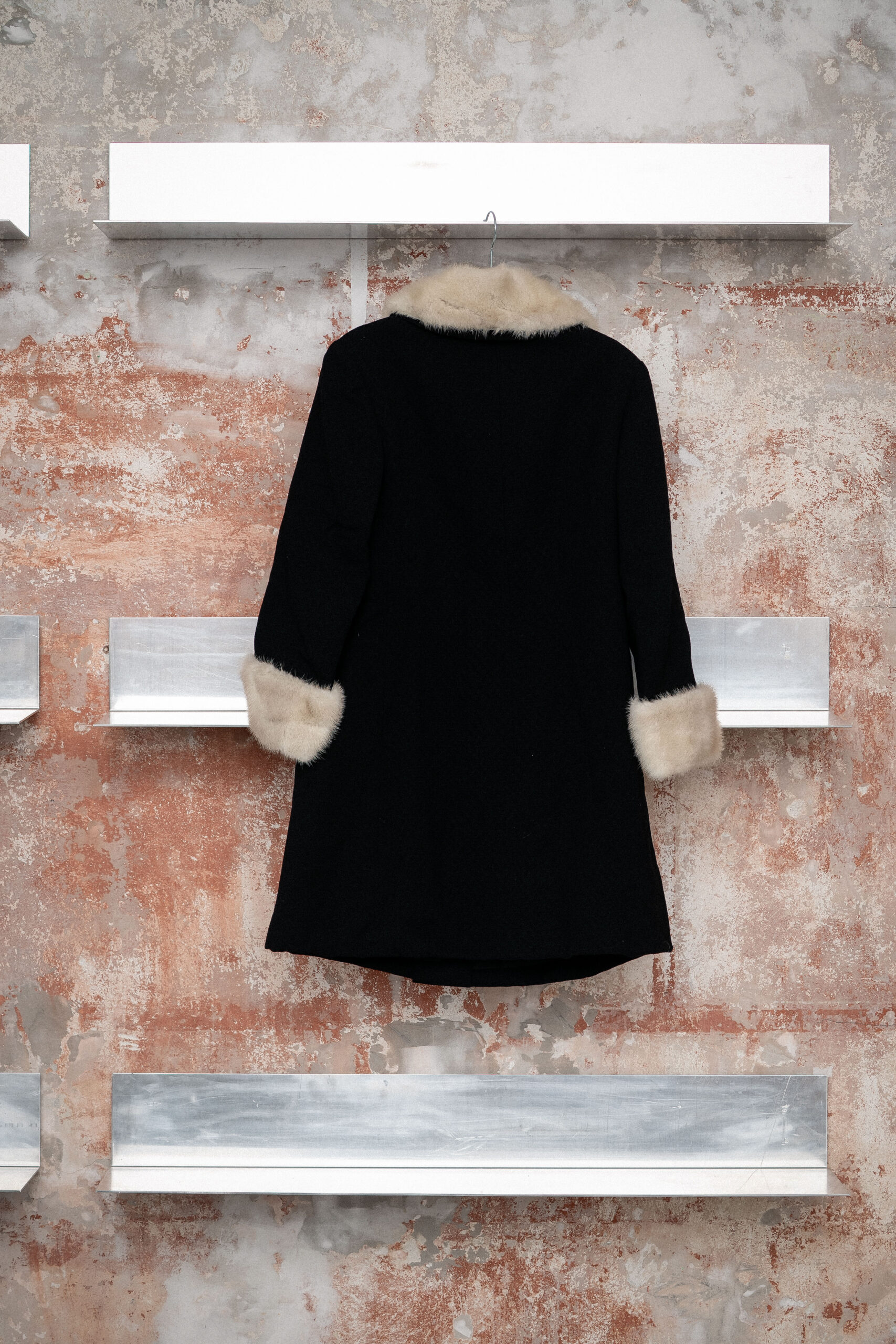 En klassisk svart kåpe fra 60-tallet, med glatt silkefôr som gir luksuriøs komfort. Kåpen har elegante strassdetaljer på knappene og praktiske lommer, som løfter det tidløse designet. Perfekt til både hverdagsbruk og festlige anledninger, og passer best i XS–Small