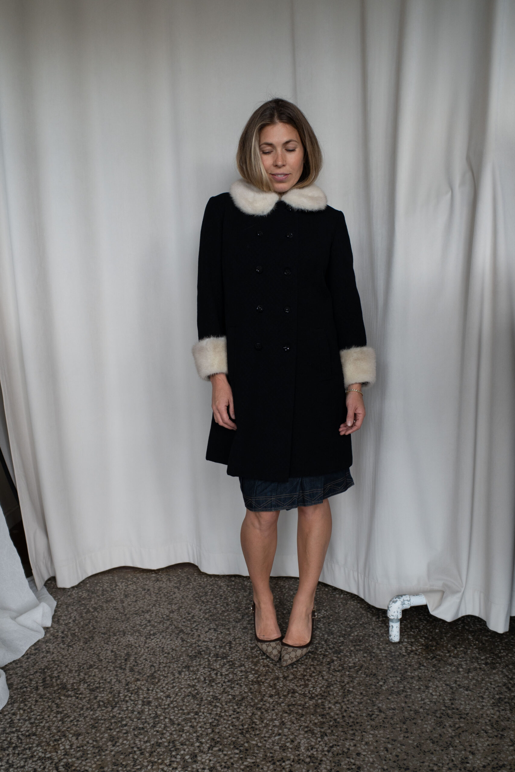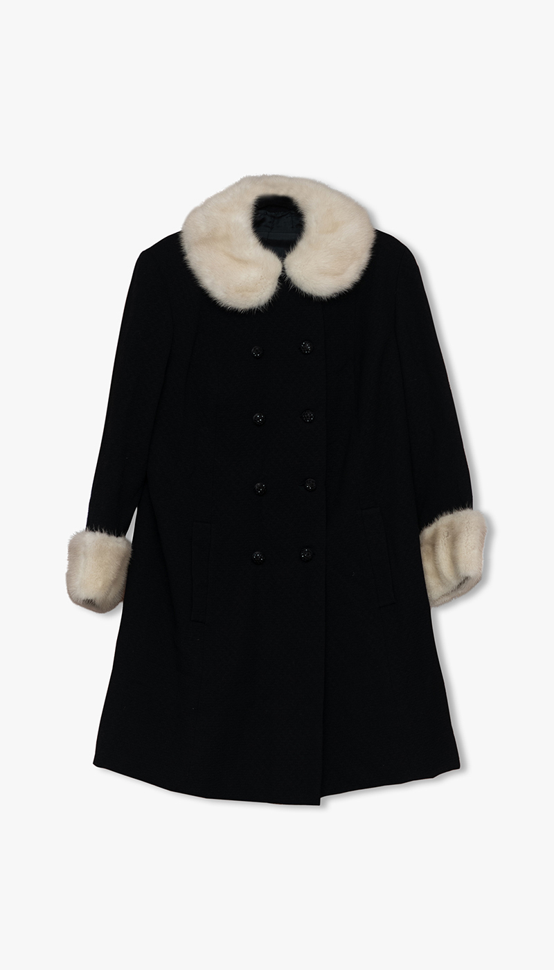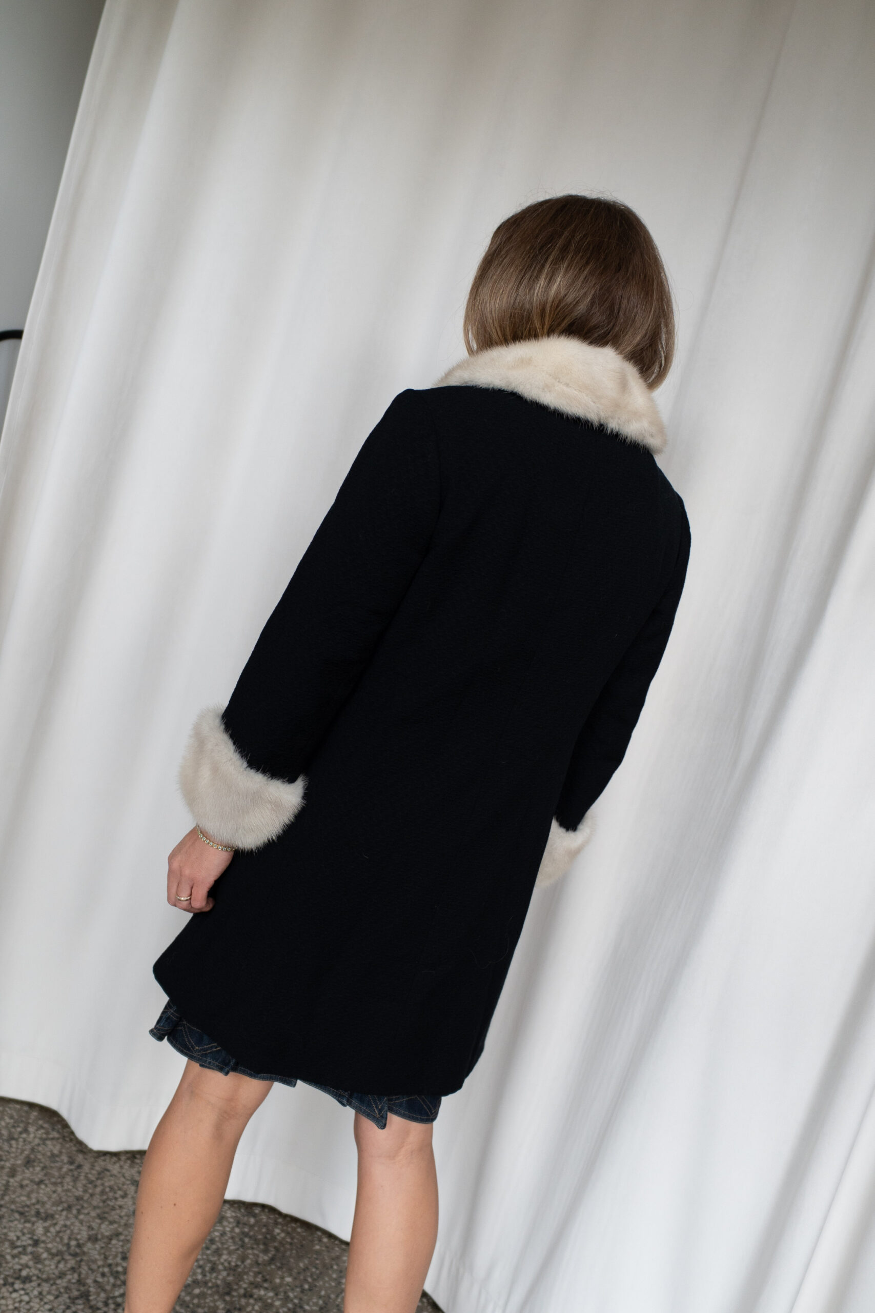 En klassisk svart kåpe fra 60-tallet, med glatt silkefôr som gir luksuriøs komfort. Kåpen har elegante strassdetaljer på knappene og praktiske lommer, som løfter det tidløse designet. Perfekt til både hverdagsbruk og festlige anledninger, og passer best i XS–Small
