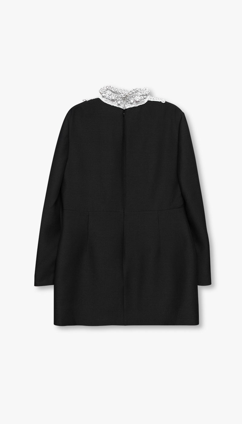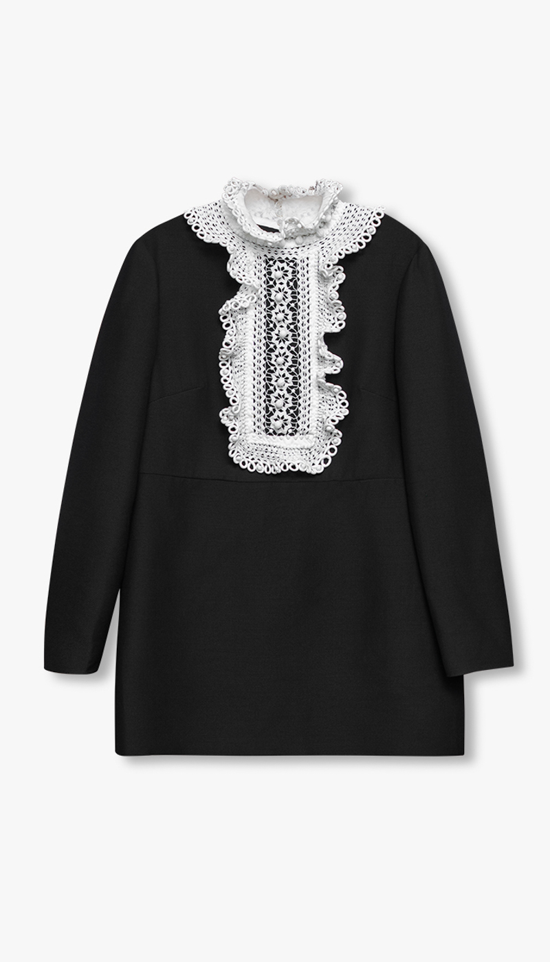 Ubrukt kjole fra Valentino med tags fortsatt på. Den sorte kjolen med hvite detaljer er laget i en eksklusiv blanding av 65 % ull og 35 % silke, som gir et luksuriøst fall og en behagelig følelse mot huden. Designet er sofistikert og gjennomført – perfekt for deg som ønsker en statement-kjole uten at uttrykket blir for prangende.