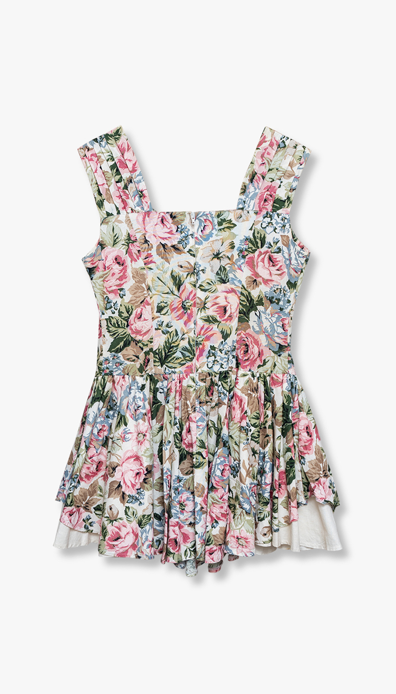 Det romantiske blomsterprintet i myke toner av rosa, grønt og blått gir kjolen et klassisk og nostalgisk uttrykk. Skjørtet har fine folder som gir lett volum og en leken bevegelse.