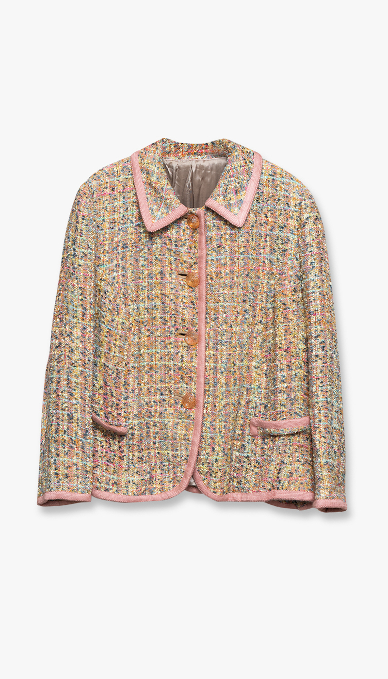 Vintage tweedjakke i pasteller – chic bouclé med rosa detaljer