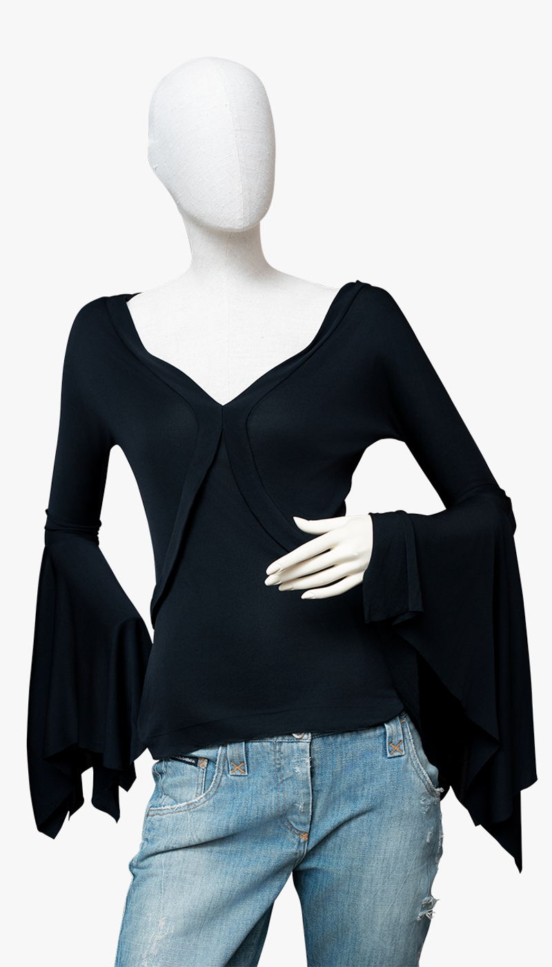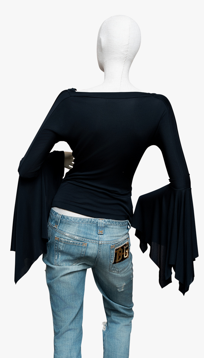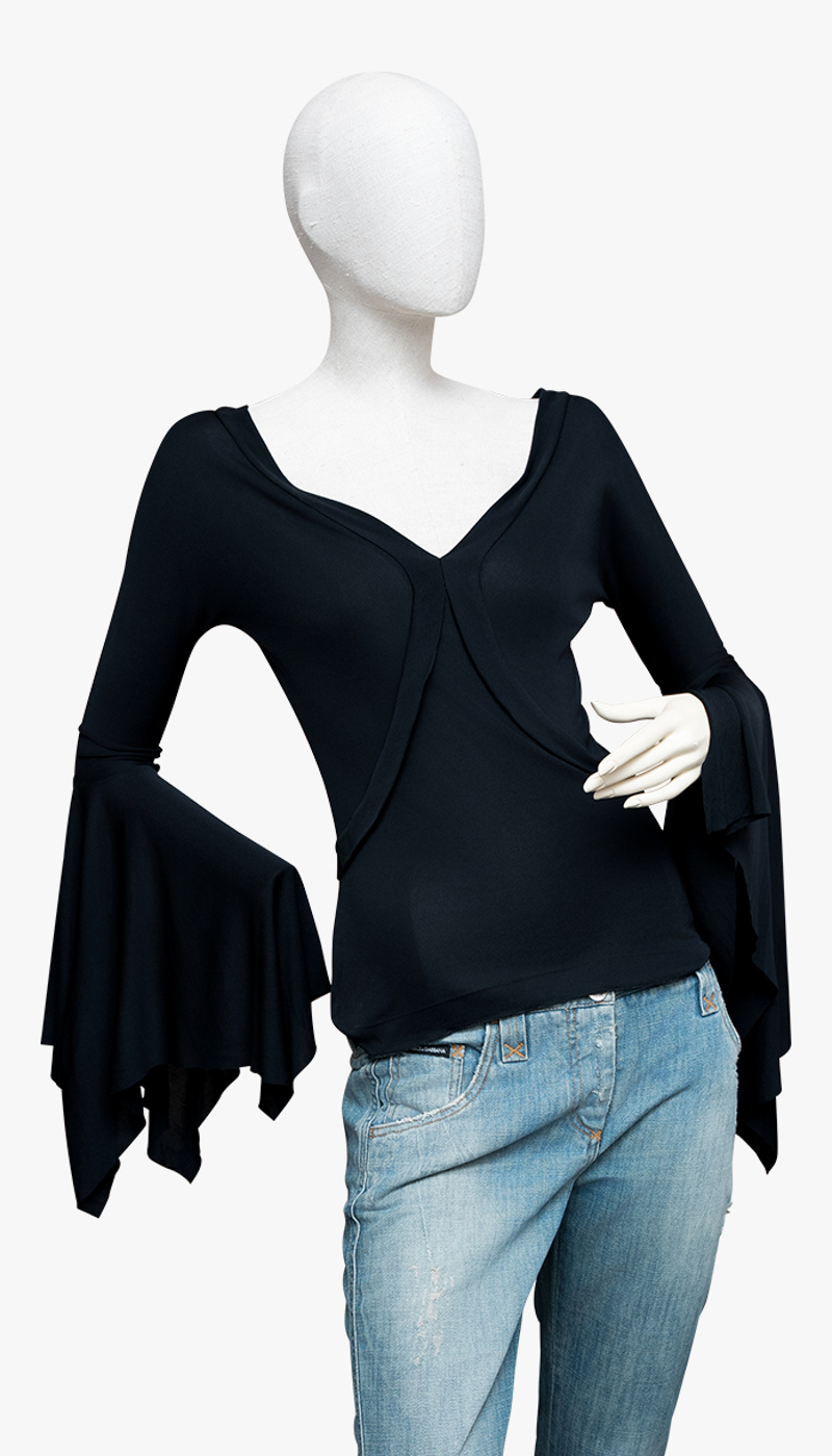 Designet i sort rayon med en dyp V-utringning og markerte, utsvingte ermer som gir et dramatisk, men raffinert uttrykk. Silhuetten er flytende og kroppsnær, med en effortless eleganse som gjør plagget like aktuelt i dag.